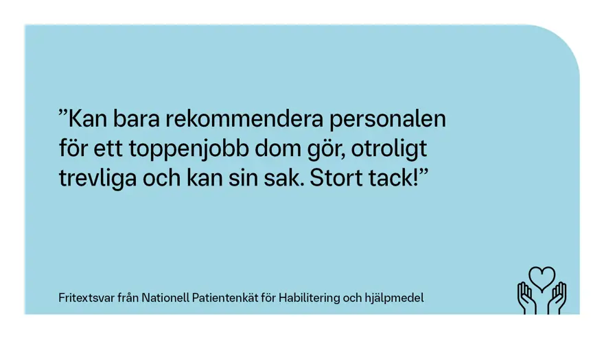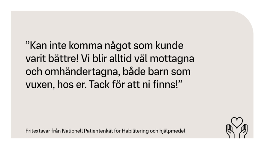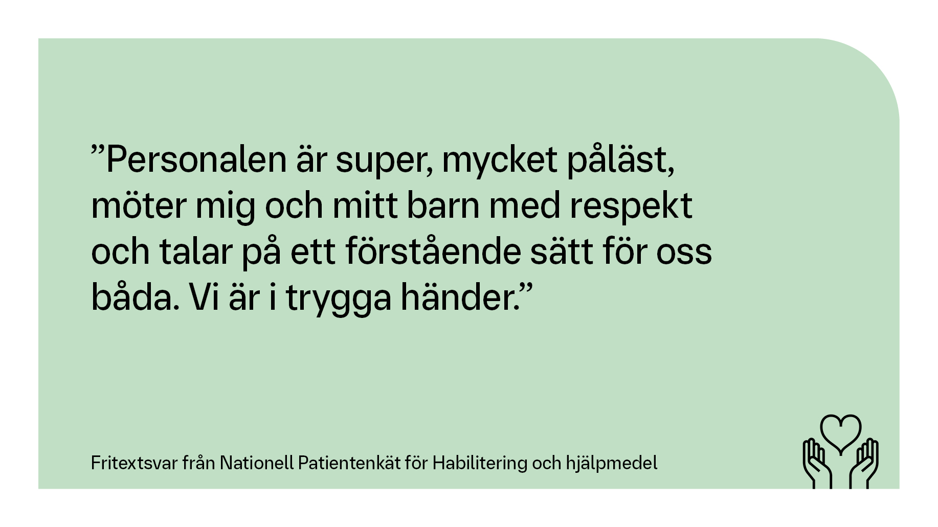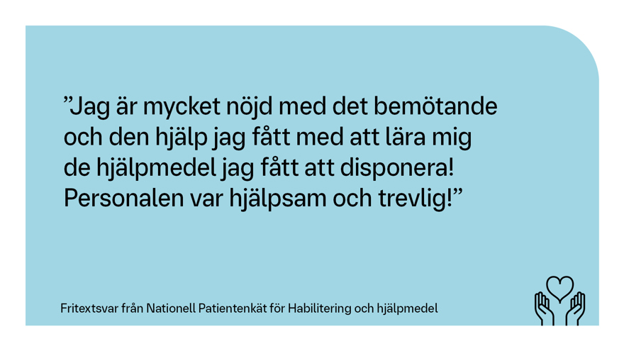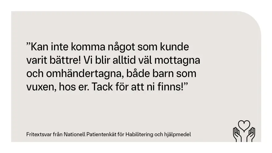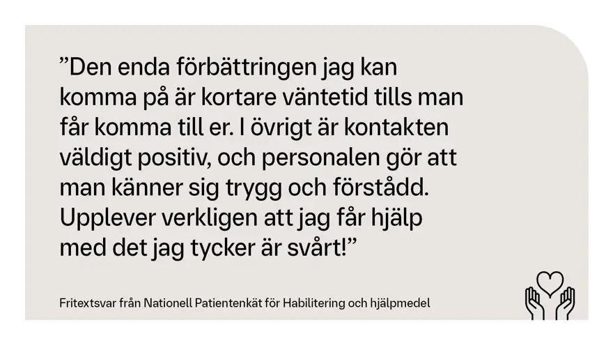 Resultaten av Nationell Patientenkät är ett kvitto på hur kunskap och engagemang skapar nytta för patienter och tolkanvändare. De flesta patienter är nöjda. Helhetsintrycket av alla enkätens dimensioner är 89%, ungefär som vid tidigare mätningar av ”Habilitering och hjälpmedel”. I ”Tolk- och taltjänst” är de svarande mer positiva än vid förra mätningen.