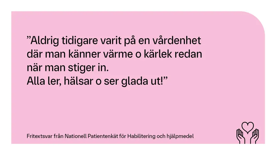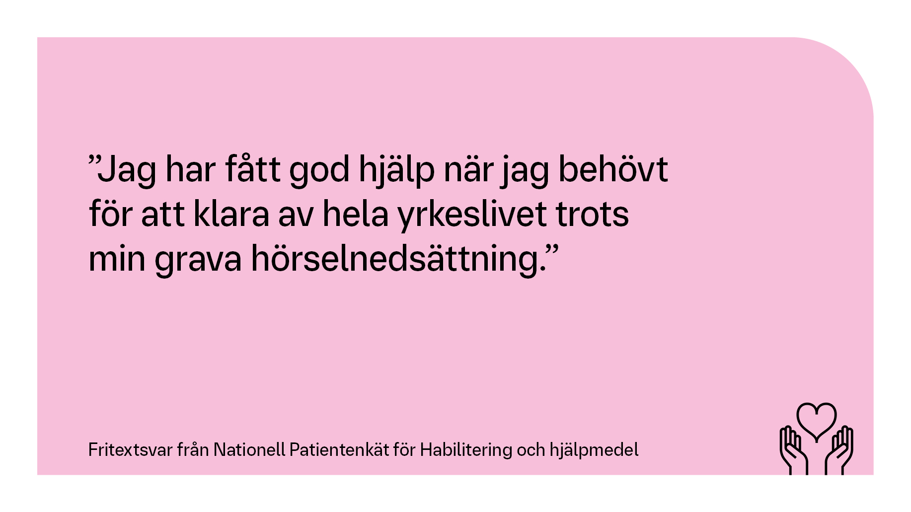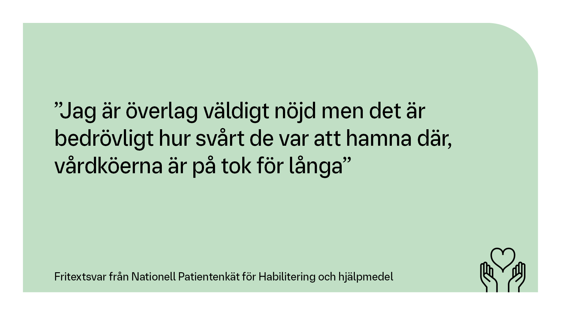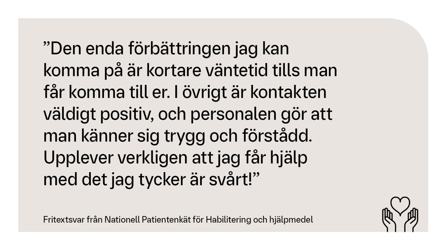 Resultaten av Nationell Patientenkät är ett kvitto på hur kunskap och engagemang skapar nytta för patienter och tolkanvändare. De flesta patienter är nöjda. Helhetsintrycket av alla enkätens dimensioner är 89%, ungefär som vid tidigare mätningar av ”Habilitering och hjälpmedel”. I ”Tolk- och taltjänst” är de svarande mer positiva än vid förra mätningen.