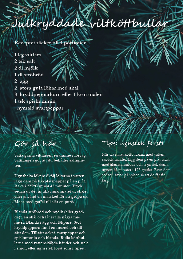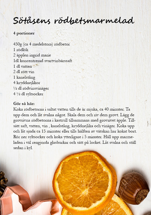 Vi bjuder på några juliga recept inför julborden i år. Testa Sötåsens rödbetsmarmelad och varför inte göra köttbullarna med viltkött i år.