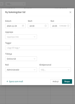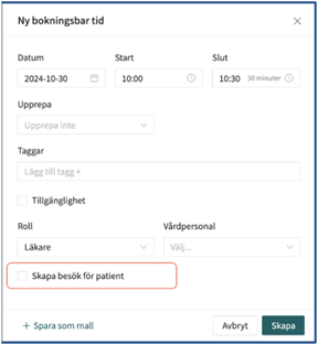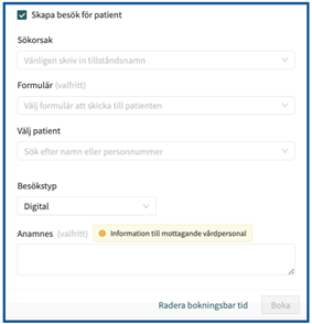 Med det nya gränssnittet kommer det finnas en ruta längst ned för att kunna direktkoppla en patient till besöket. Bockar du i rutan kommer nya fält att dyka upp där du väljer vilken patient det gäller, sökorsak, formulär mm. Det går även att redigera redan existerande schemalagda tider med att lägga till patient i efterhand (klicka då på den schemalagda tid du vill justera och bocka i rutan ”Skapa besök för patient”).