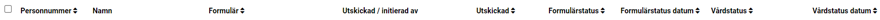 - Om du vill så kan du först använda filtreringsfälten för att filtrera fram önskade formulär. För att välja alla i listan så klickar du i rutan till vänster om kolumnrubriken Personnummer.