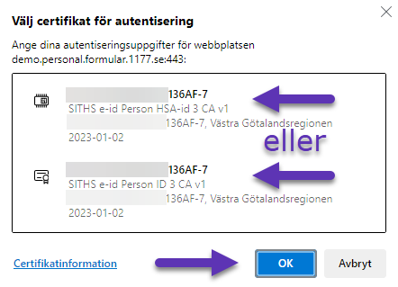 - Om du ser en popup-ruta "Välj certifikat för autentisering" och om du behöver välja bland flera certifikat, klicka på något av dem, och sedan OK.