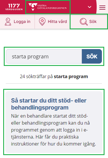 - Be invånaren att gå till 1177.se, kontrollera att "Västra Götaland" är vald, klicka på "Sök" och skriva in "starta program". Det översta sökresultatet ska leda till sidan "Så startar du ditt stöd- eller behandlingsprogram" (se ovan). Det går också att hänvisa till: 1177.se/starta-program-vgr. Om denna länk inte fungerar behöver invånaren först välja region (Västra Götaland), alternativt ange denna adress: 1177.se/vastra-gotaland/starta-program-vgr