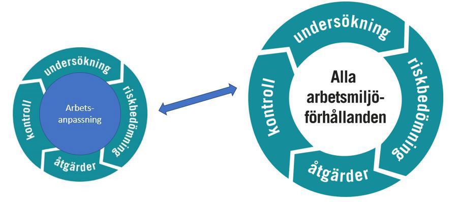 När det finns behov av individuell arbetsanpassning, se vänster hjul nedan, trots de åtgärder som vidtagits i det generella arbetsmiljöarbetet kring SAM – Systematiskt arbetsmiljöarbete, d.v.s. det högra hjulet.