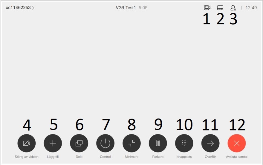 Styrkontroller och slå av/på kamera finns alltid som touch-knappar på pekskärmen (se bild under Pekskärmen i möte)
