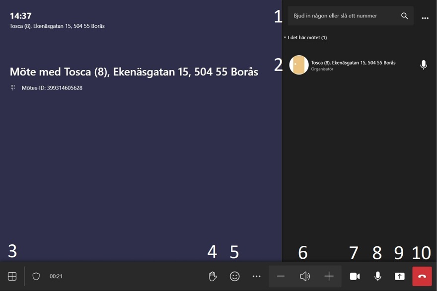 - Deltagarlistan visar alla som deltar i mötet samt om deltagaren eller mötesrummets mikorfon är på eller av