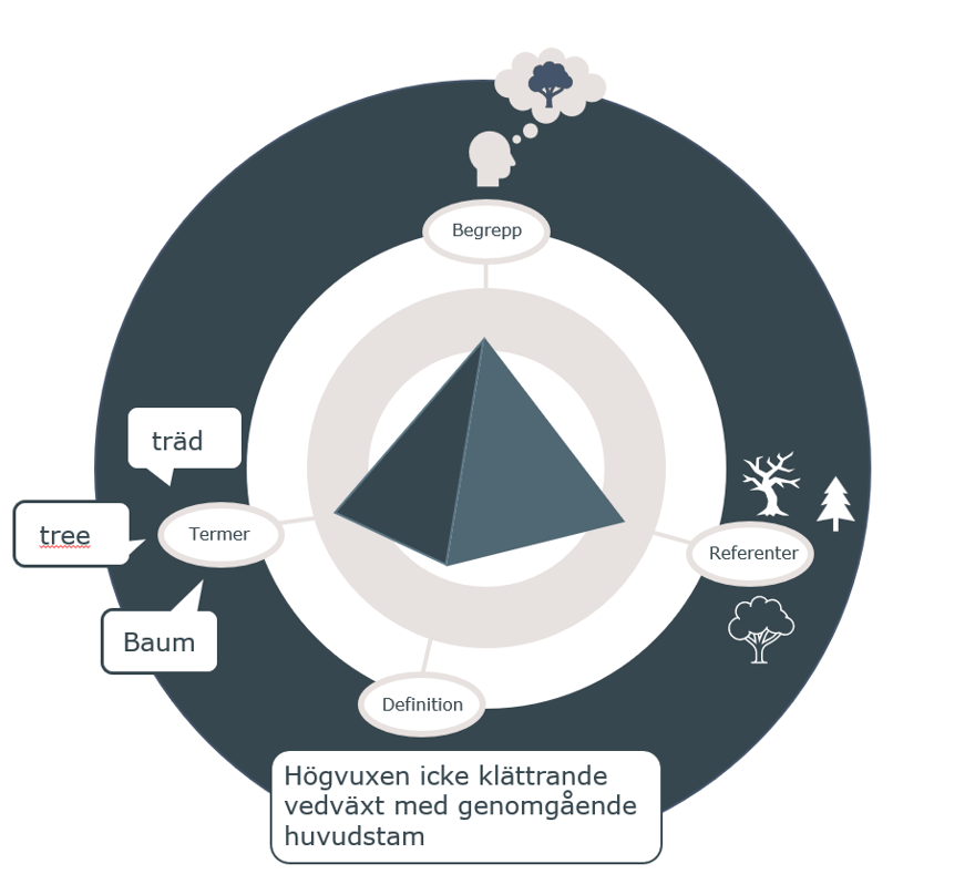 I den språkliga världen finns dels de termer som vi använder när vi kommunicerar om begreppen inom ett fackområde, dels definitioner som beskriver begreppen.