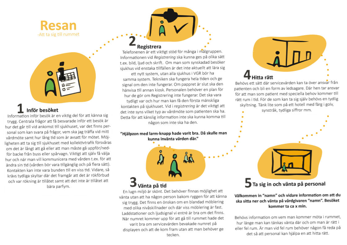 Efter att ha fått till sig planritningarna för det nya sjukhuset gick representanterna från Samråd funktionshinder igenom de delar som ett besök på sjukhuset kan komma att innefatta. Allt från att patienten får besked om tid för besök, till att patienten själv ska kunna registrera sin ankomst i entrén och sedan hitta rätt mottagningsrum. Varje delmoment avslutades med diskussioner kring upplevelsen. De tankar, behov och reflektioner som uppkom har sammanställts i ”Resan – Att ta sig till rummet” och resultatet kommer användas i den fortsatta planeringen av Högsbo specialistsjukhus.