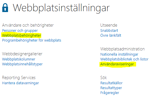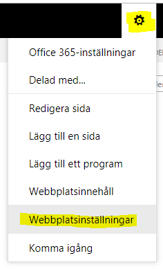 Grundläggande administration av en samarbetsyta sker via menyvalet Webbplatsinställningar som finns under kugghjulet uppe till höger på sidan