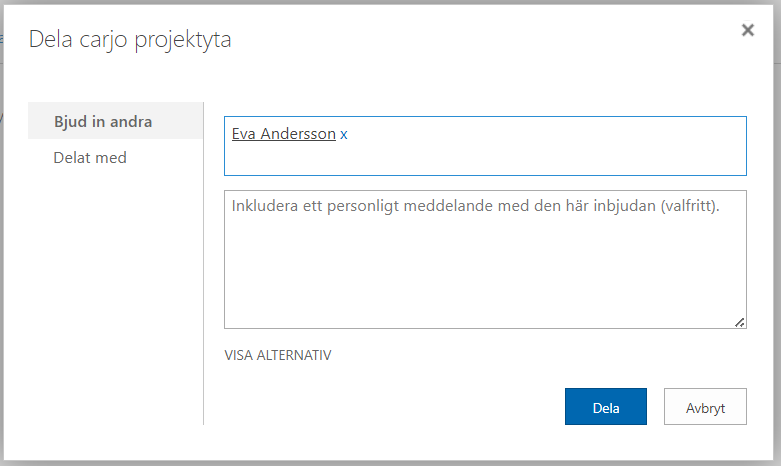 - I dialogrutan som visas skriv in namn på den eller de användare som ska läggas till i aktuell deltagargrupp. Det går att skriva ett personligt meddelande till den eller de som bjuds in samt under Visa alternativ välja om deltagaren ska få e-post om inbjudan till samarbetsyta. När alla fält fyllts i välj Dela.