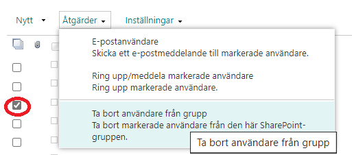 - Markera namnet för den deltagare som ska tas bort och välj Åtgärder och sedan Ta bort användare från grupp.