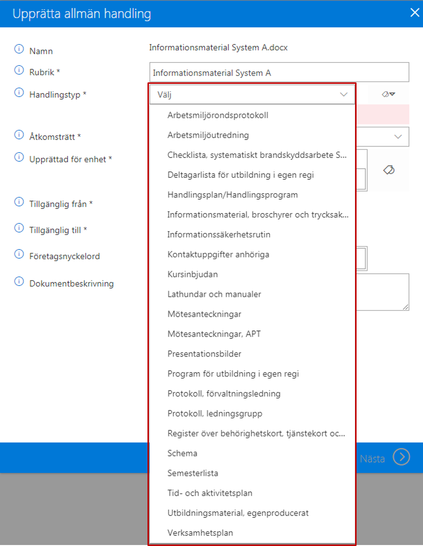 Vid upprättande av allmän handling anges vilken Handlingstyp dokumentet är. I dialogrutan för upprättande av allmän handling visas en favorithandlingstyplista som visar de handlingstyper, från myndighetens informationshanteringsplan, som anses vara de vanligast förekommande på samarbetsytan (favoriter).