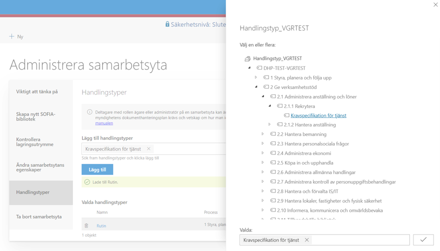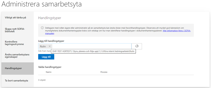 - I fältet Lägg till handlingstyper kan du söka fram en handlingstyp. Genom att placera markören på handlingstypen kan du se hela sökvägen för handlingstypen (dvs vilken process som den tillhör).