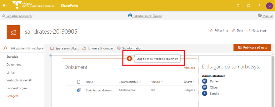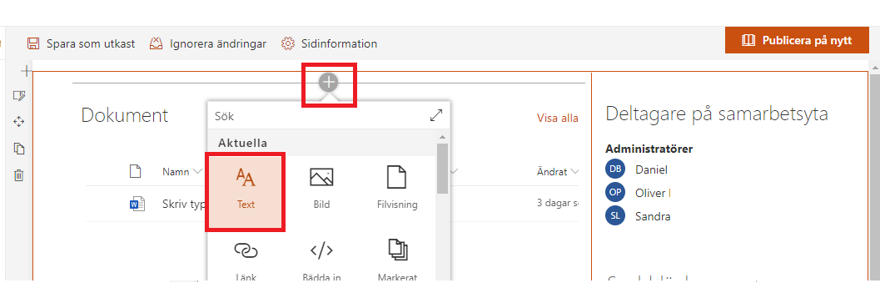 Observera att om man valt att klicka på Redigera och sedan inte vill spara ändringarna eller att man ångrar sig är det viktigt att klicka på Ignorera ändringar och inte bara lämna sidan. Om sidan bara lämnas ligger den kvar i redigeringsläge för alla deltagare på samarbetsytan och blockerar för övriga deltgare att redigera den.