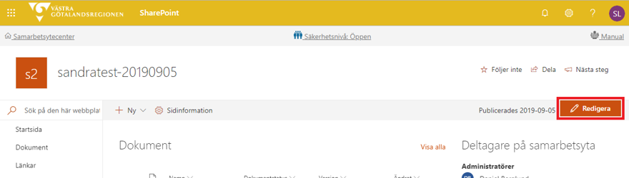 - Klicka på Redigera-knappen som finns i övre högra hörnet på sidan. Om knappen inte syns kan administratör eller ägare på samarbetsytan ändrat vilka som har behörighet att ändra startsidan.