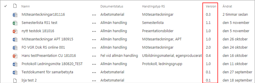 I ett dokumentbibliotek i en samarbetsyta går det i dokumenthanteringsprocessen arbeta med utkastversioner , det vill säga delversioner som till exempel version 0.3 eller 1.5 och huvudversioner/heltalsversioner till exempel version 1.0 eller 2.0. Läs mer i avsnittet Publicera till huvudversion. Upprättade allmänna handlingar tilldelas alltid en ny huvudversion i samband med upprättandet.