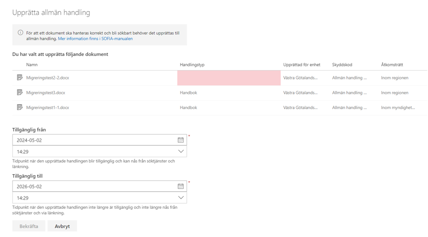 Det finns möjlighet att massupprätta upp till 20 st dokument på en gång. Dock måste alla dokument som upprättas vara försedda med obligatoriska metadata. Dokumenten behöver inte ha samma metadata utan kan vara olika.