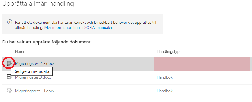 Genom att klicka på redigeringssymbolen för dokumentet kan man ändra eller lägga till saknad metadata såsom Handlingstyp.