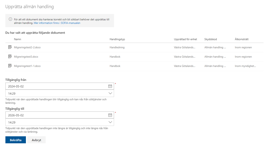 Därefter klickar man på Bekräfta och dokumenten läggs därefter i en kö till Mellanarkivet och upprättas efter hand.
