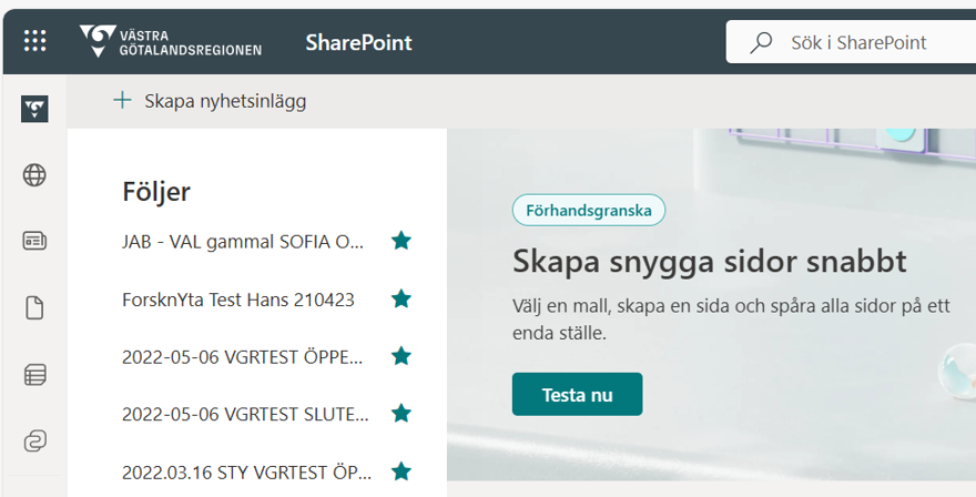 Om man nu inte vill gå via SamarbetsyteCenter så kan man nå följda samarbetsytor via den s.k "våfflan" istället som visas längst uppe till vänster i webbläsaren. Välj SharePoint, du skickas då vidare till startsidan för SharePoint kallad SharePoint Home.