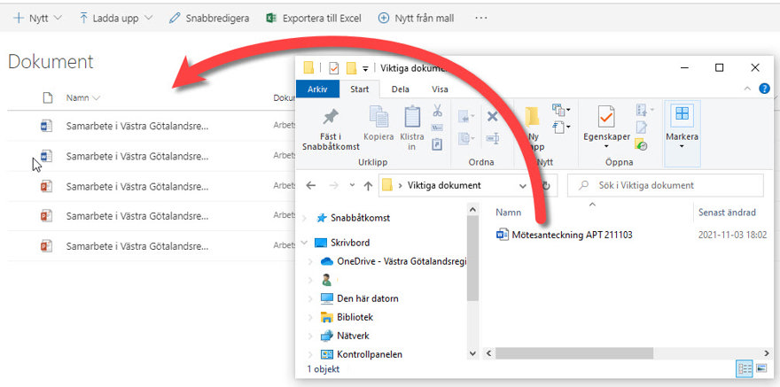 - Klicka och dra dokumentet till dokumentbiblioteket i samarbetsytan och släpp dokumentet där.