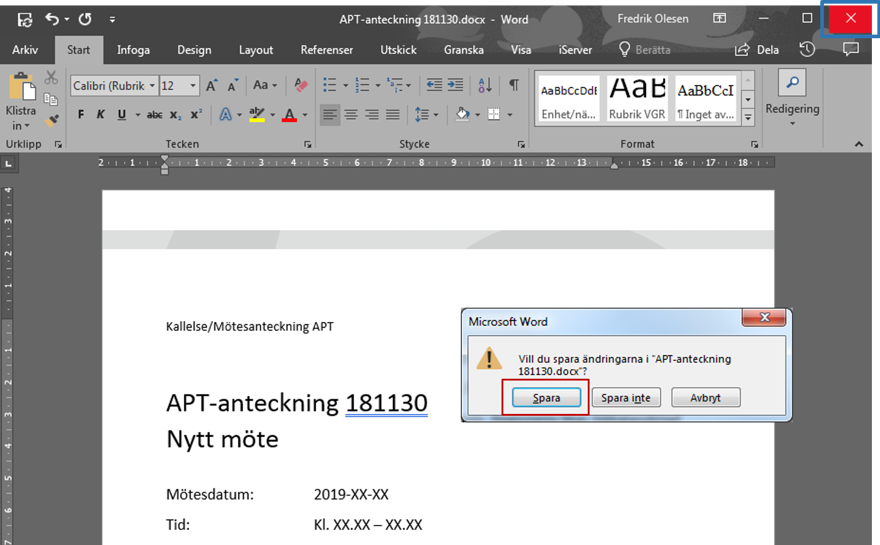 - För att spara ändringarna stäng fönstret genom att klicka på krysset längst uppe till höger och välj att spara dokumentet.
