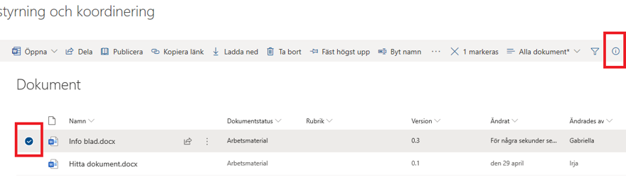 - Bocka för dokumentet och klicka på informationsfönstret.