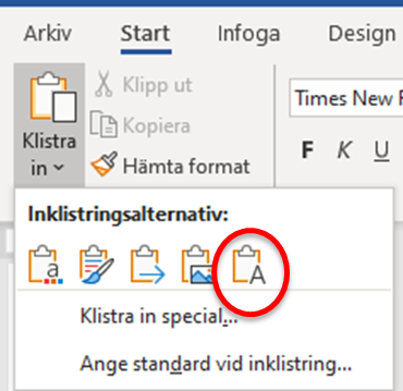 När du ska klistra in text från ett befintligt dokument ska du välja Behåll endast text, se symbolen nedan. Detta är viktigt för att uppfylla kraven på tillgänglighet i dokumentet, därför får inte de förinställda formaten ändras. Gå igenom dokumentet så att de innehåller rätt format innan dokumentet upprättas.