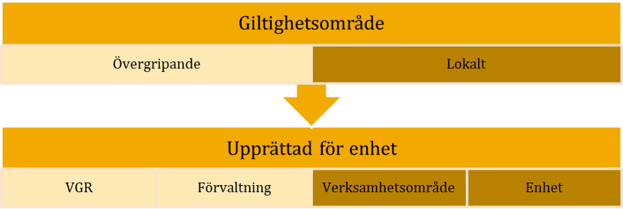 För varje styrande dokument som upprättas ska giltighetsområde anges. Giltighetsområde kan vara antingen Övergripande eller Lokalt. Observera att det finns en koppling till dokumentegenskapen Upprättad för enhet. Indelningen i Övergripande och Lokalt är viktig eftersom sökmotorn för styrande dokument grupperar/markera dokumentets giltighetsområde utifrån genomförd sökning. Giltighetsområdet talar också om för vilken/vilka verksamheter dokumentets innehåll gäller.