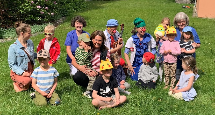 Sjukhusclownerna kom på besök när barndiabetes-teamet i Lidköping bjöd in till småbarnskafé. På bilden medverkar också Lekterapeut Cathrine Nordström och diabetessjuksköterskorna Helen Andersson och Monika Karlsson.