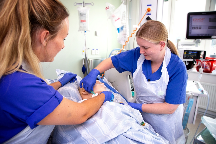 -Vi lägger stort fokus på praktisk träning. Alla deltagarna får öva diverse moment på attrapper och en övningsdocka som är utrustad med diverse infarter, läkemedelspumpar och respirator. Stor vikt läggs på att sköta luftvägarna samt att förstå helheten i behandling och omvårdnad av en svårt sjuk patient, säger sjuksköterskan Anki Vikström som leder utbildningen tillsammans med undersköterskan Andréa Stensson.