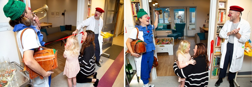 Detta firades 26 oktober och när det är fest då dundrar givetvis sjukhusclownerna in för att sätta fart, färg och fläkt på atmosfären. De tutade en lite vinglig invigningssalut, som följdes av jubel. När det var dags att klippa det röda bandet uppstod dock ett problem för clownerna visste inte hur man gjorde. Tur då att lilla Alice fanns på plats, så att hon kunde hjälpa till att hantera saxen på rätt sätt. Sedan fortsatte invigningen med mingel, dryck och tilltugg och de som ville kunde också ägna sig åt papperspyssel, bokinspiration och bokstavsjakt med hemligt ord.