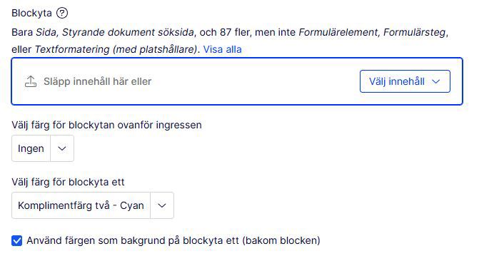 På informations- och startsidor kan du göra inställningar för att använda färgade block (ett begränsat urval av block). Bakgrunden bakom blocken kan också färgas.