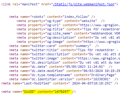 "SidID" content="1470297" />. Den där siffran är unik för varje sida, och 1470297 är unikt för den sida du är på just nu.
